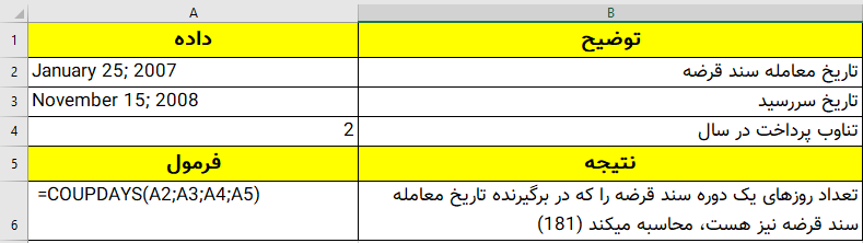 بیایید نگاهی به مثالی از تابع COUPDAYS اکسل بیندازیم تا با نحوه استفاده از آن بیشتر آشنا شویم: